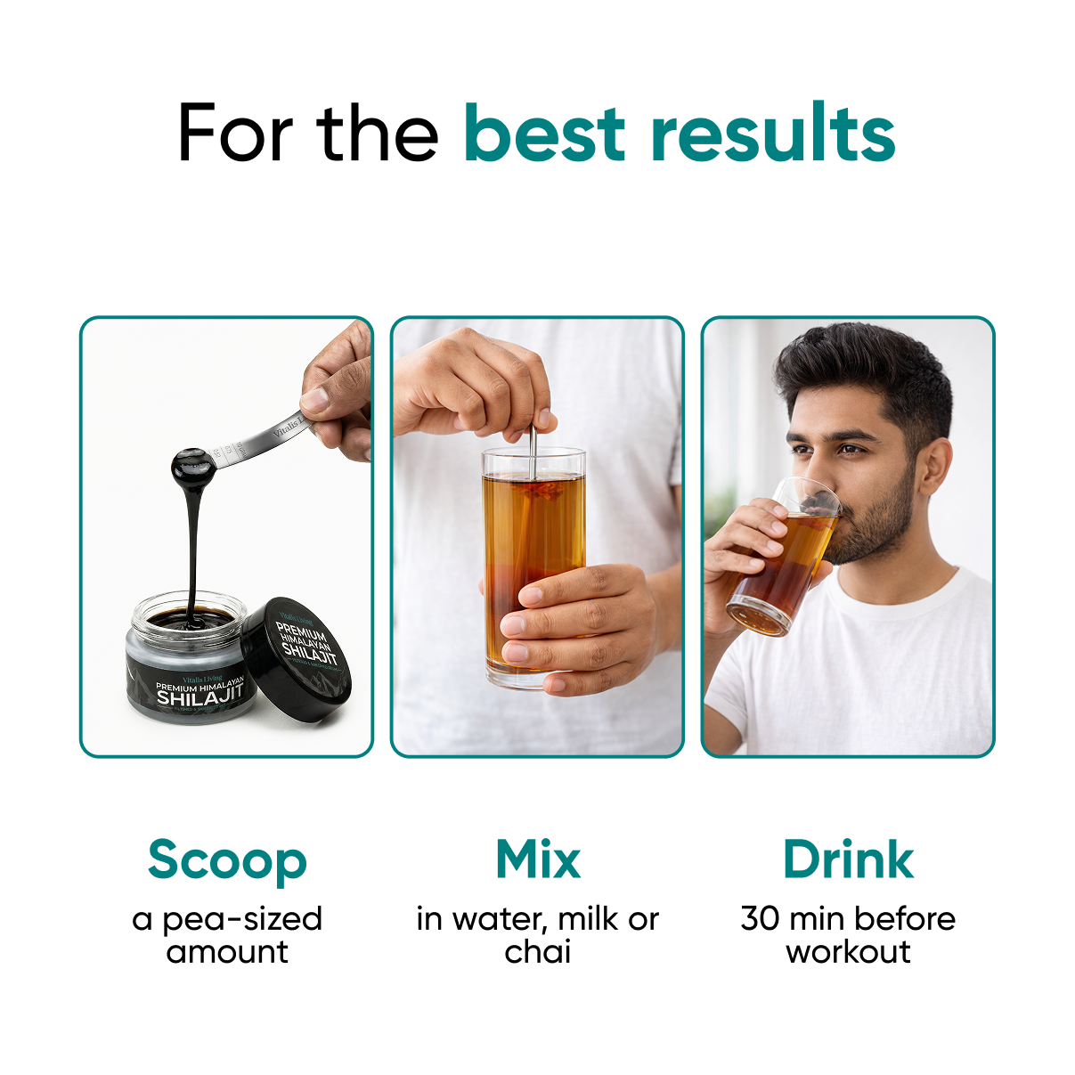 Mix a small amount (pea-sized) of Shilajit in warm water, milk, or tea. - Stir Until Fully Dissolved